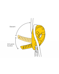 - Paso automático de la empuñadura a la posición de guardado cuando la cuerda es retirada del aparato, lo que permite reducir los riesgos de enganche involuntario cuando el descensor se lleva en el arnés.